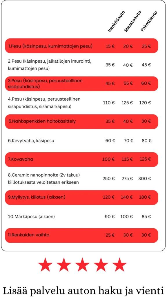 Huomio! * Korjaushintojen osalta voit ottaa meihin yhteyttä ja saat parhaan hinnan. Hinnasto Soita Varaa aika